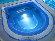 Согласитесь, такой набор разнообразных дополнительных установок в плавательном бассейне встретишь нечасто, а ведь рядом с основной чашей размещается еще и собственно гидромассажный бассейн, который, в свою очередь, оборудован системой Jet-Air на пять посадочных мест и аэромассажным перфорированным лежаком. Гидромассажная система Jet-Air обеспечивает импульсный точечный массаж мощной водовоздушной струей. Аэромассаж мягко воздействует на тело, расслабляя его после утомительных тренировок.